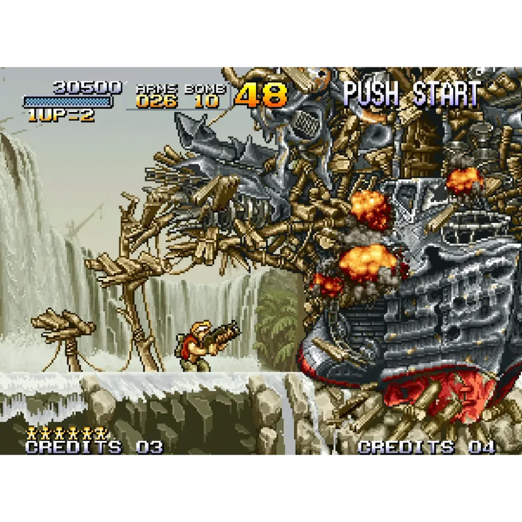 ミイラ化・肥満化などの変身システムが加わりゲームの幅が一気に広がった2作目。新たな乗り物やステージバリエーションも大幅増加し、ボリュームは前作を大きく上回る。処理落ちが多い点がやや惜しいが、それを差し引いても楽しめる密度がある。改善版のメタルスラッグXと合わせて遊ぶのがおすすめだ。