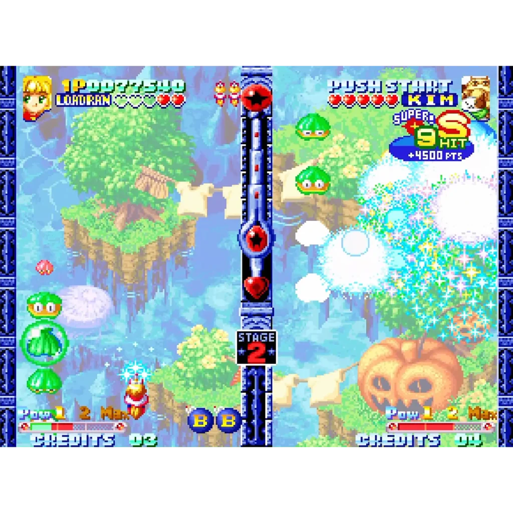 縦スクロールシューティングに対戦要素を組み込むという当時全く新しい発想のゲーム。敵を連鎖爆発させて相手フィールドにダメージを与えるシステムが格闘ゲームに慣れたネオジオユーザーにも刺さる。可愛い魔法少女風キャラの見た目に反し、対戦が始まると完全に別のゲームになる。